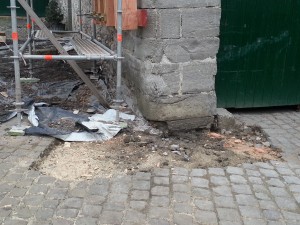 Cette grange a traversé les siècles, présentant une ou l’autre lézarde fort stable. Mais en 2012, ces fissurations se sont majorées de manière exponentielle, s’élargissant, les pierres de l’arc en plein cintre de la porte se fissurant l’une après l’autre. Le bâtiment s’affaissait et allait tomber.